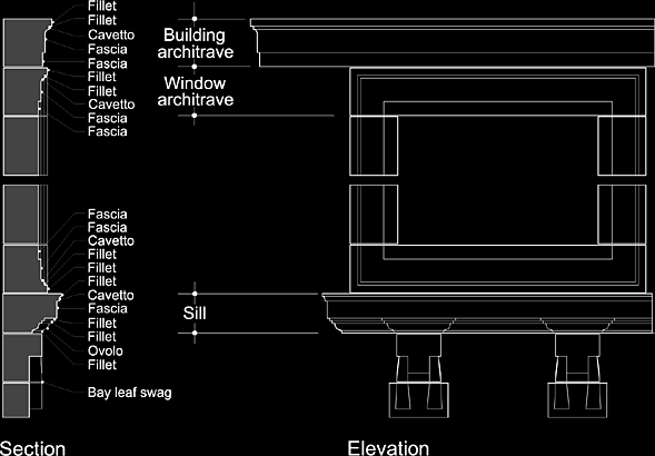 The limestone window trim has the same profile as that of the architrave, the lowest part of the entablature, as is common in buildings articulated with the orders of architecture. The profile consists of, from the inside edge, a narrow fascia, a broader fascia ending in a congé, a narrow fillet, and a broader fillet.