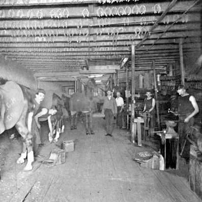 Interior of one of the Fiss, Doerr and Carroll Horse Company stables at the Bull’s Head Market on East 24th Street. Workers are shown in the company’s horseshoeing department.